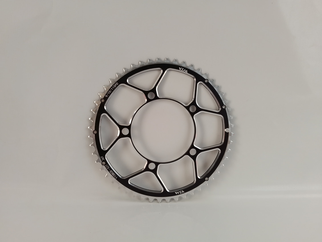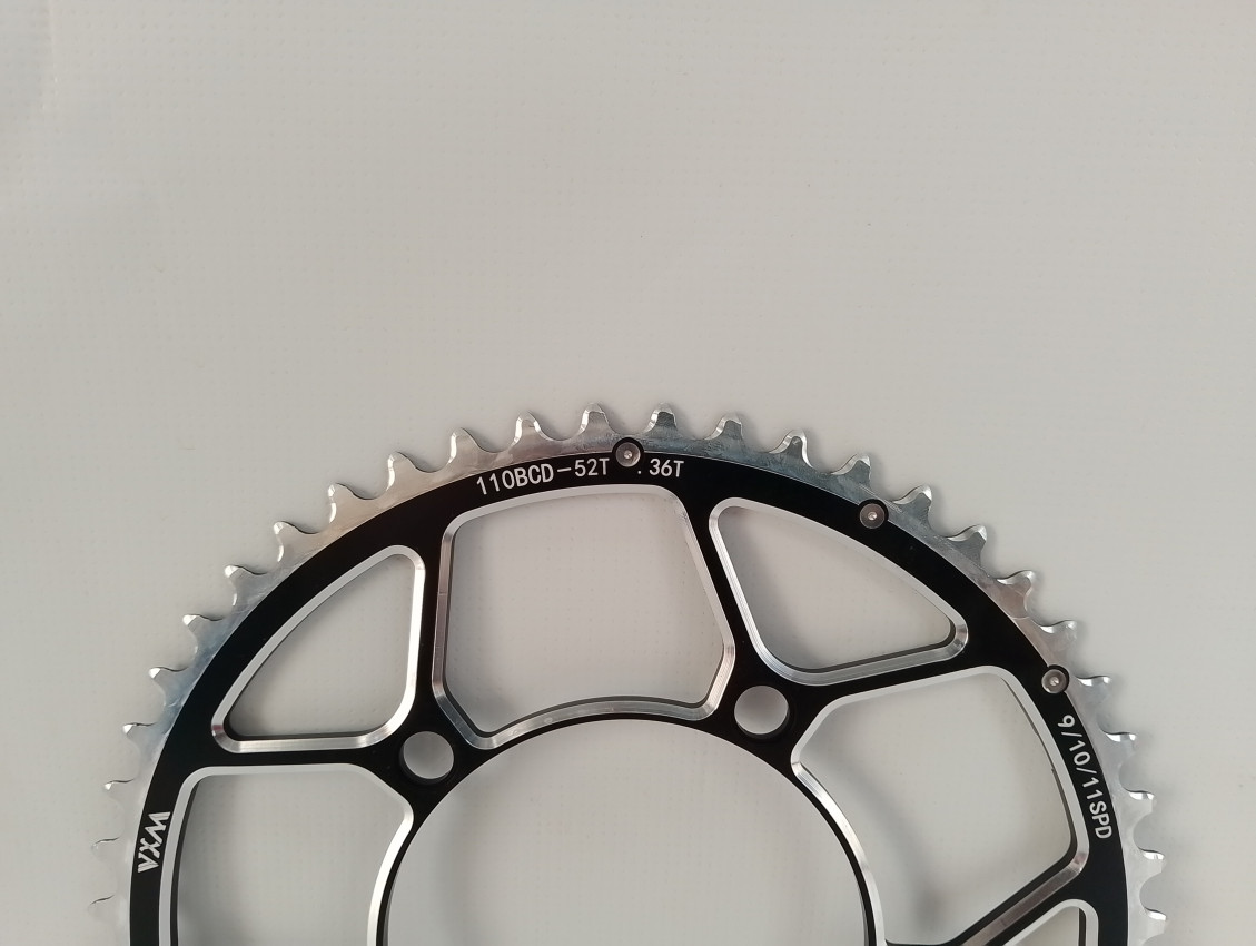 Brand new VXAA alloy chain ring, 110mm BCD 52t. Suitable for road bikes. Shimano/SRAM compatible and also compatible with 9-11 speed chains.