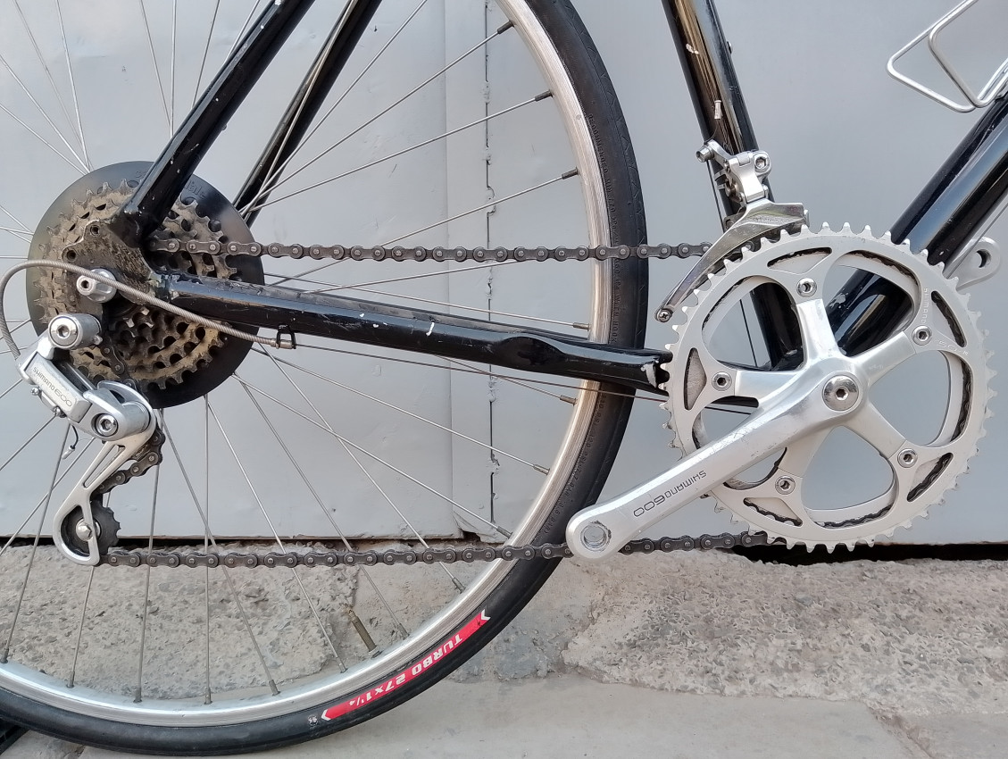 High quality used vintage race bike. Wheel size 27 1 1/4. Frame material Aluminium with steel fork.Top tube 57cm, seat tube height 56cm. Gear system 2x6 with thumb shifters. Cog type freewheel. Other features: all wheels have quick release.