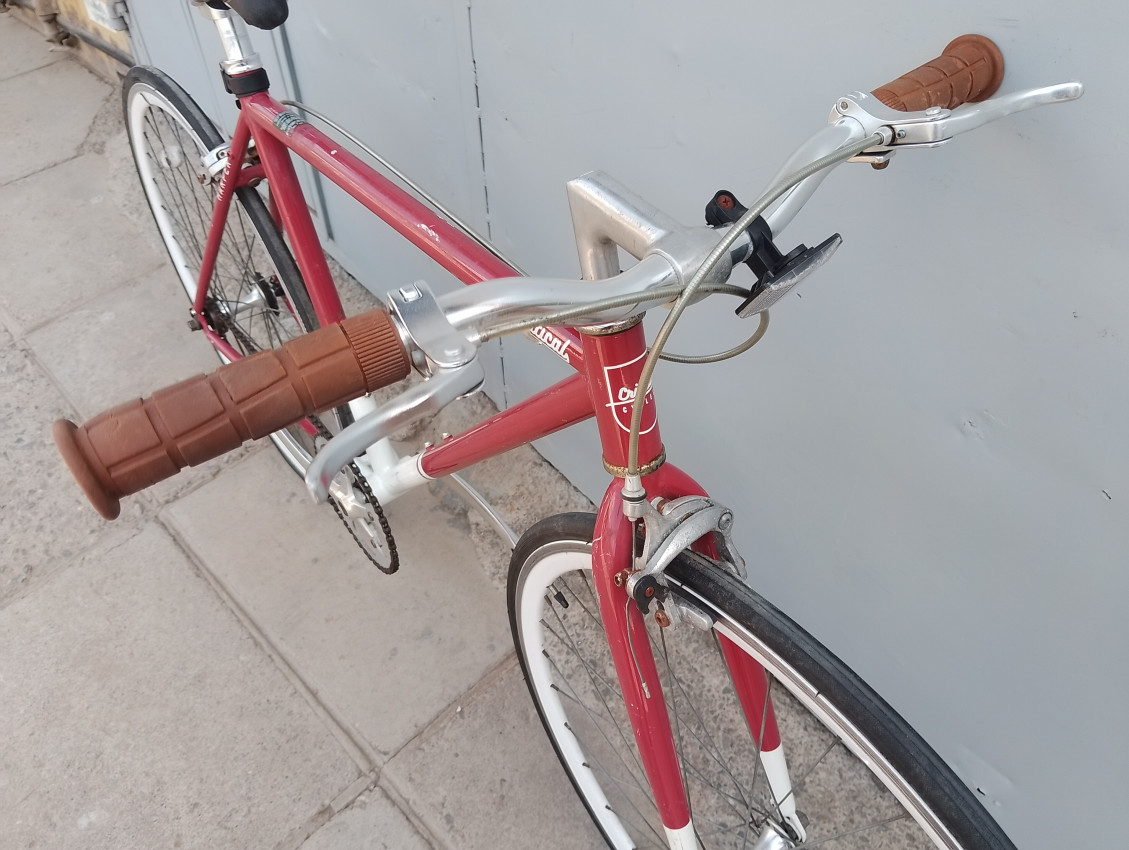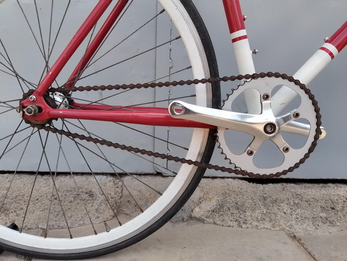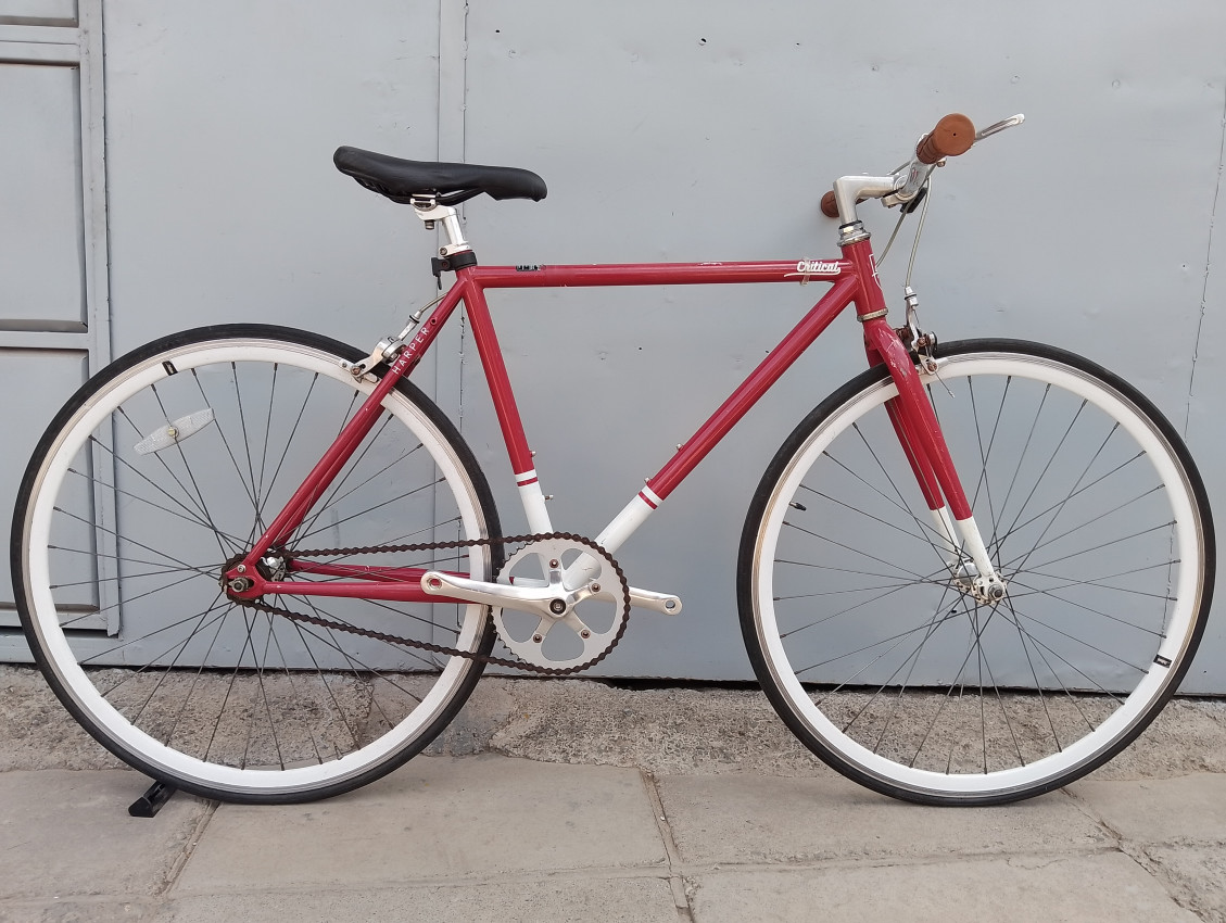 High quality used hybrid bike. Wheel size 700c. Frame material steel. Top tube 21.5', seat tube height 19'. Gear system single speed. Cog type freewheel, sealed BB.