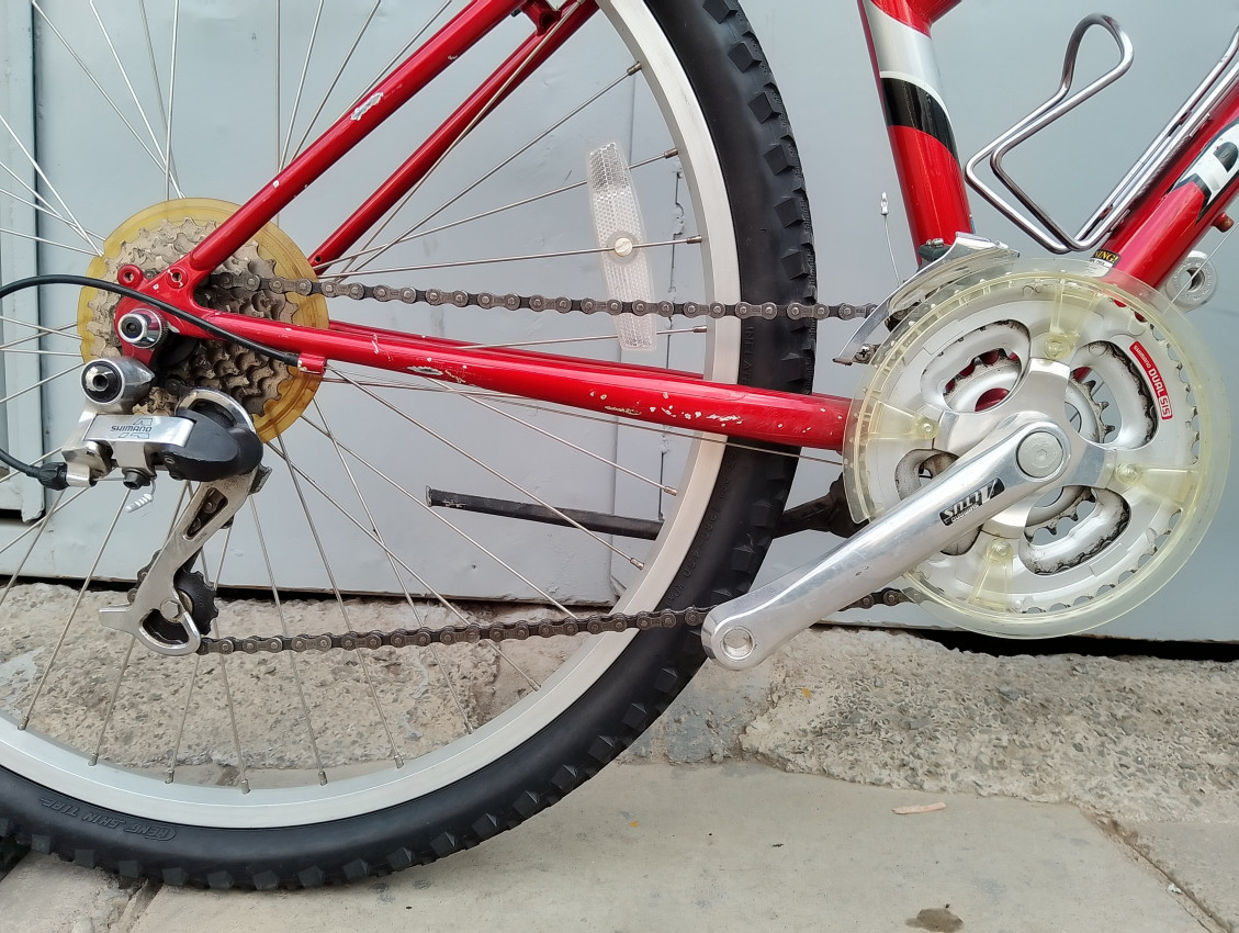 High quality used mountain bike. Wheel size 26. Frame material steel with steel fork. Top tube 21', seat tube height 16'. Gear system 3x7 with grip shift. Cog type cassette. Quick release on both wheels.