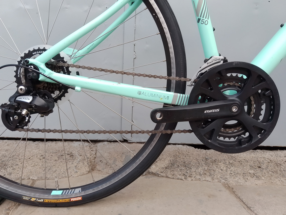 High quality used hybrid bike. Wheel size 700c. Frame material Aluminum with steel fork. Top tube 21', seat tube height 19'. Gear system 3x7 with shimano trigger shift brake levers. Cog type freewheel. Other features: sealed BB all wheels have quick release.