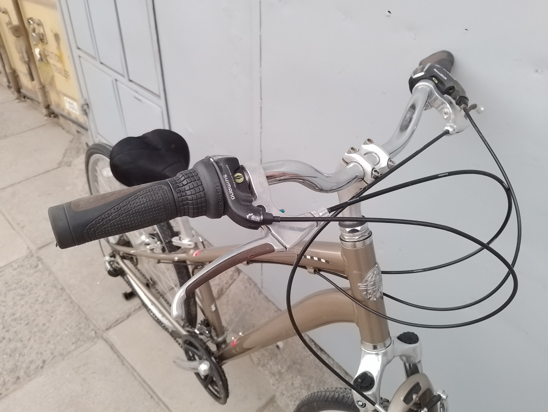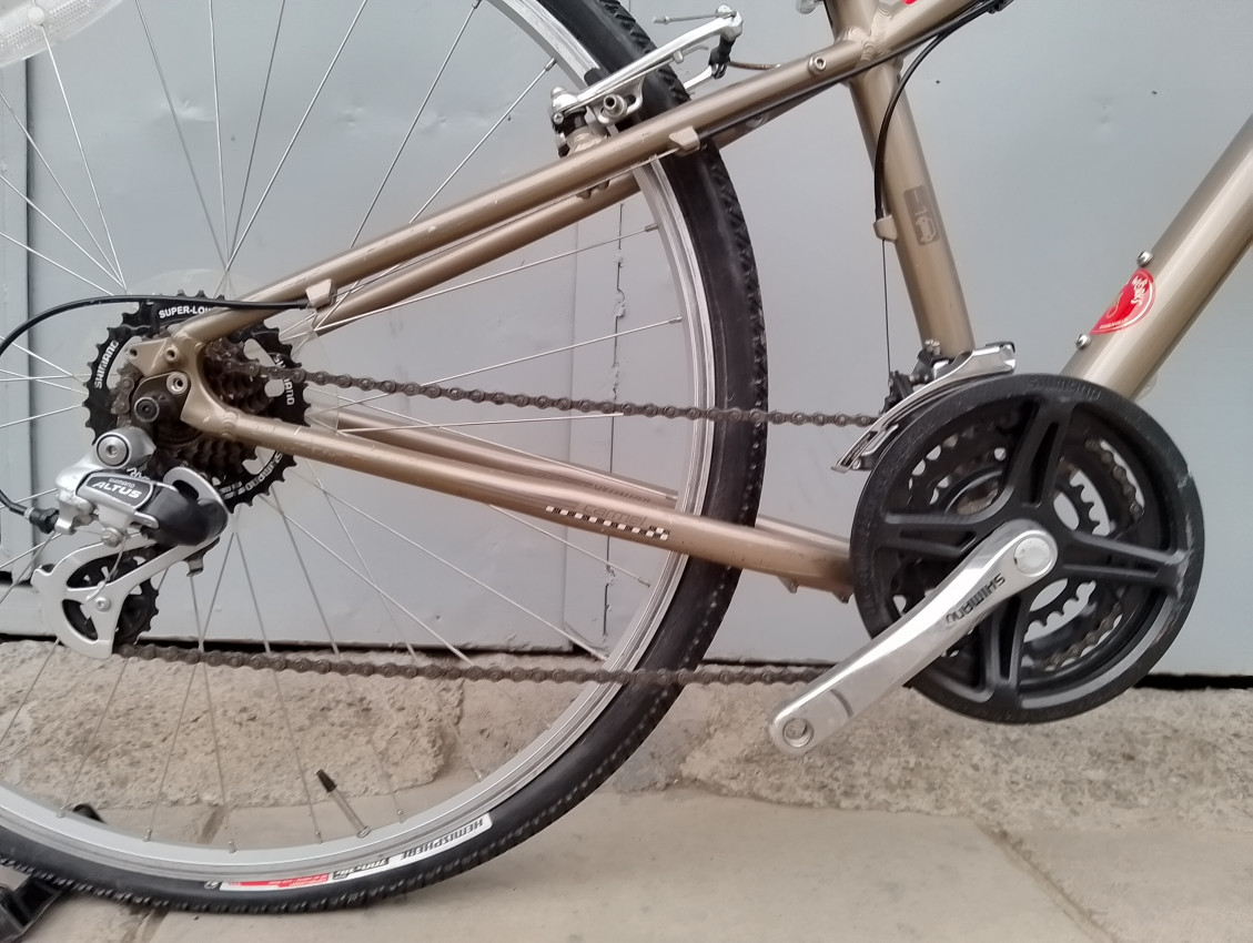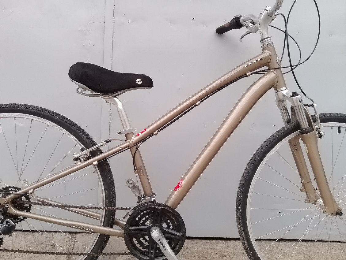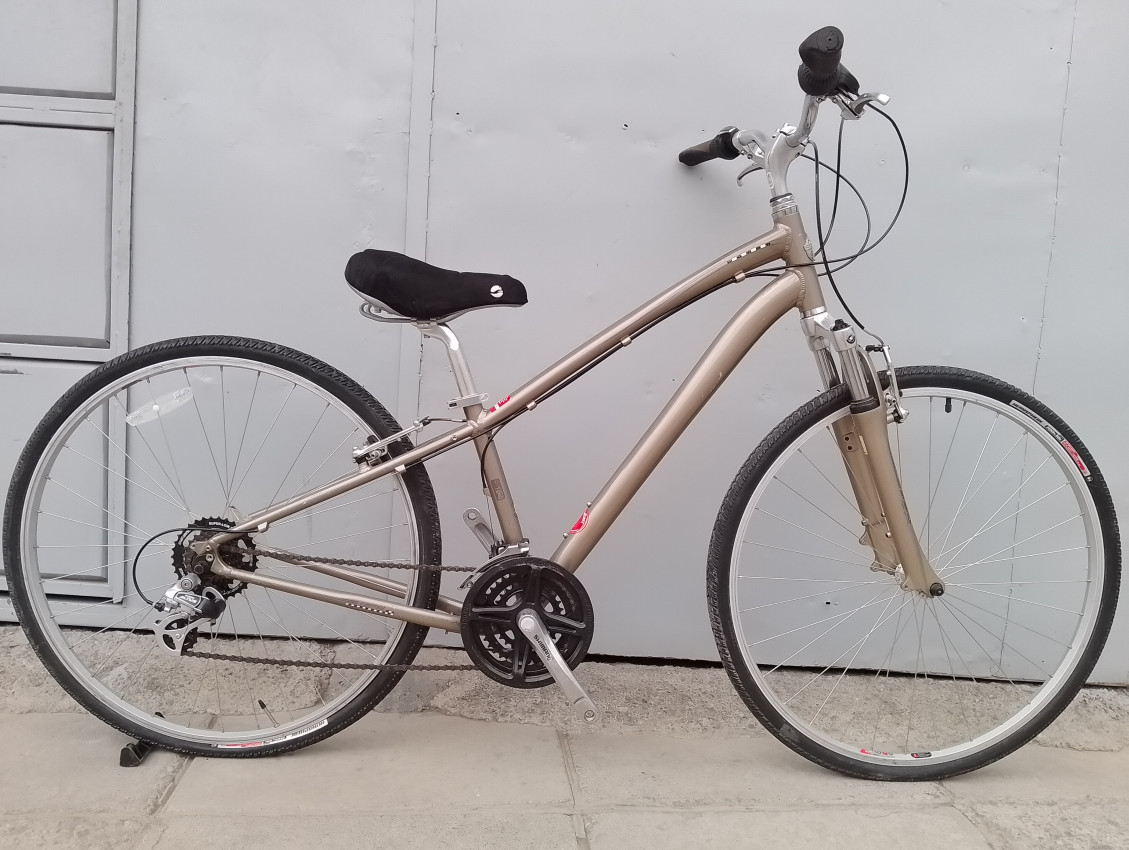 High quality used hybrid bike. Wheel size 700c. Frame material Aluminium with aluminium fork. Top tube 23', seat tube height 14'. Gear system 3x7 with shimano grip shift . Cog type freewheel. Other features: sealed BB, alloy suspension fork, all wheels have quick release.