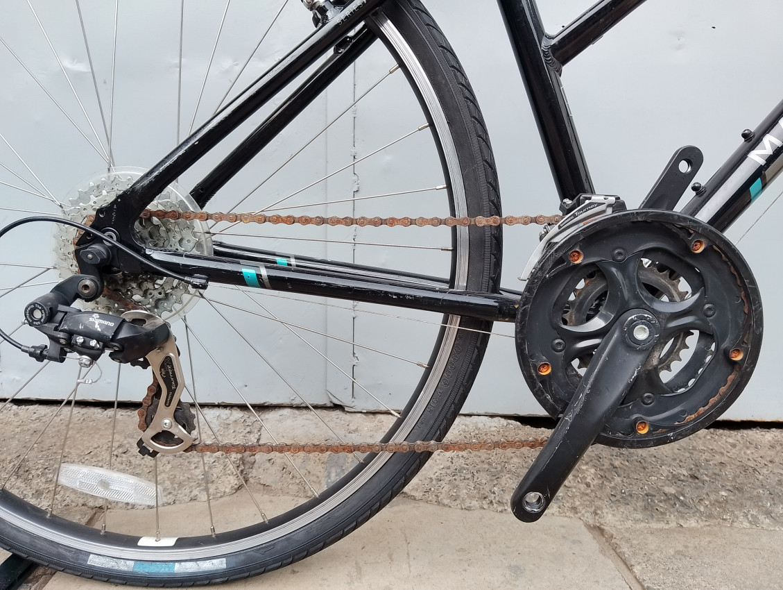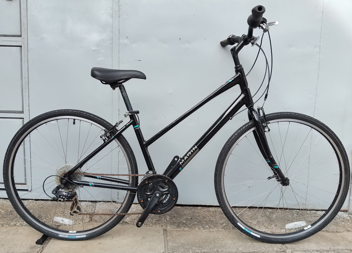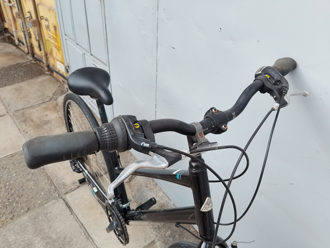 High quality used hybrid bike. Wheel size 700c. Frame material Aluminium.Top tube 23', seat tube height 17'. Gear system 3x7 with grip shifters. Cog type cassette. Other features: sealed BB all wheels have quick release.