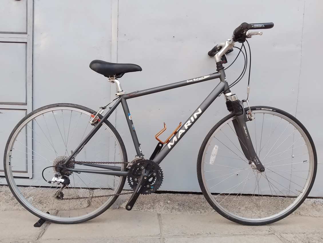 High quality used hybrid bike. Wheel size 700c. Frame material steel with front alloy suspension fork. Top tube 22', seat tube height 18.5'. Gear system 3x8 with Shimano trigger shifts. Cog type cassettee. Other features: sealed BB, all wheels have quick release, front steel/aluminium alloy suspension fork