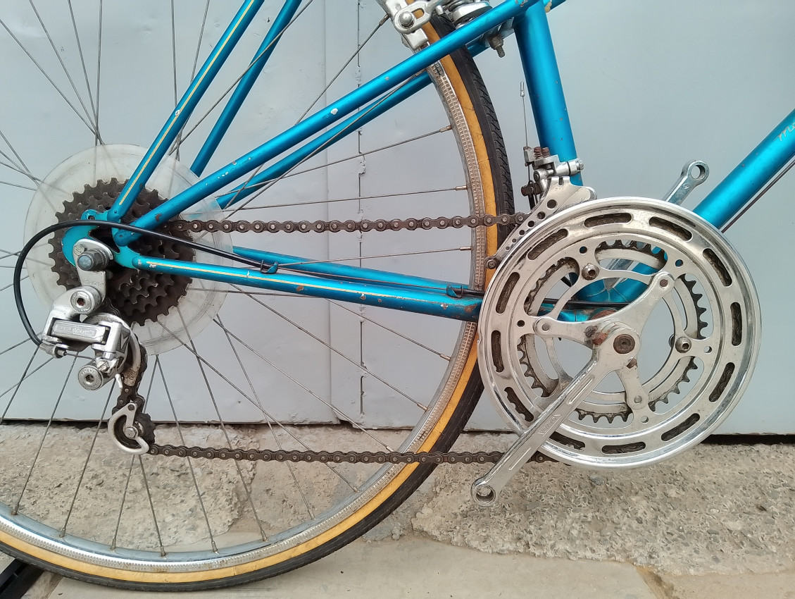 A High quality used vintage race bike. Wheel size 27 1 1/4. Frame material steel. Top tube 55cm, seat tube height 54cm. Gear system 2×5 with thumb shifts. Cog type freewheel. Other features: front wheel have quick release.