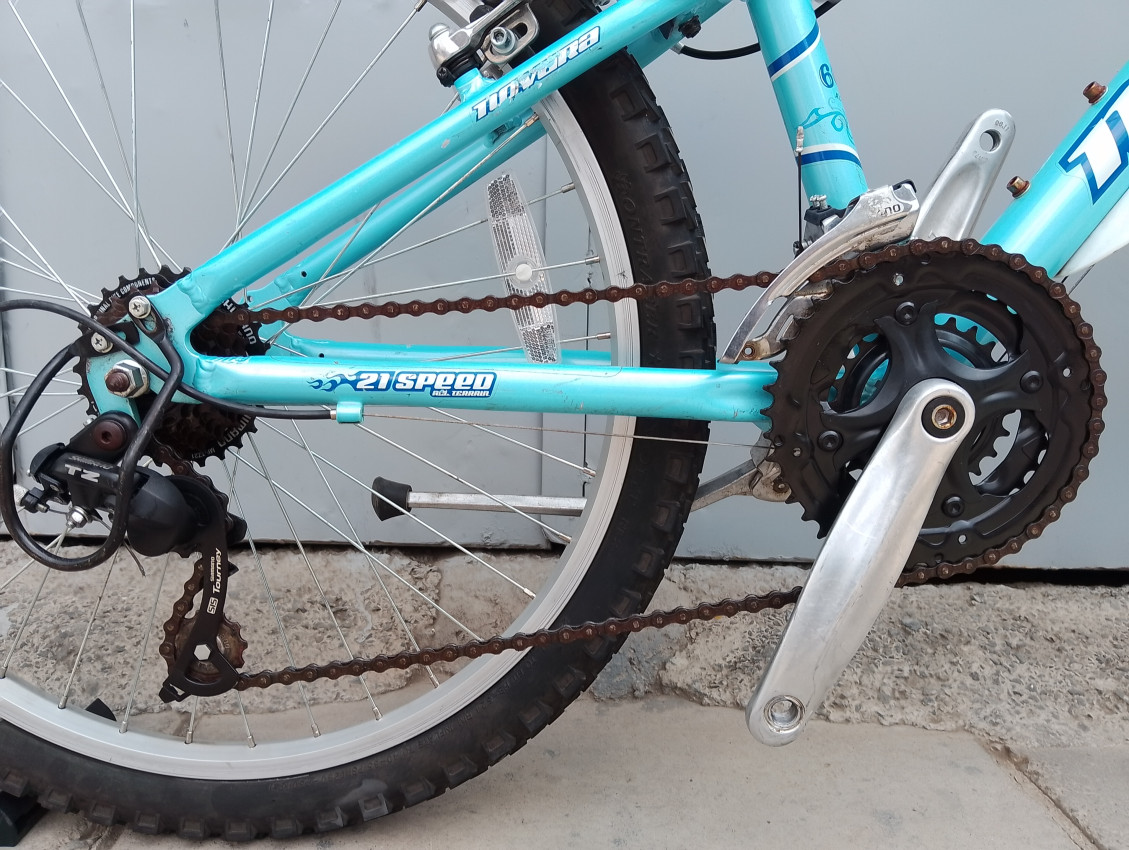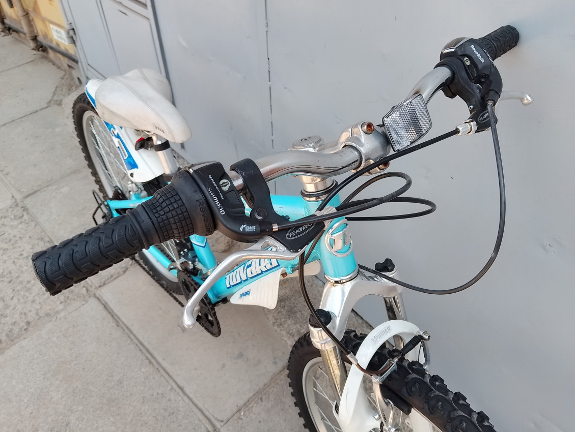 High quality used mountain bike. Wheel size 24 Frame material aluminium. Gear system 3x7 speed with shimano grip shifters. Cog type freewheel. Other features: front suspension fork, sealed BB.
