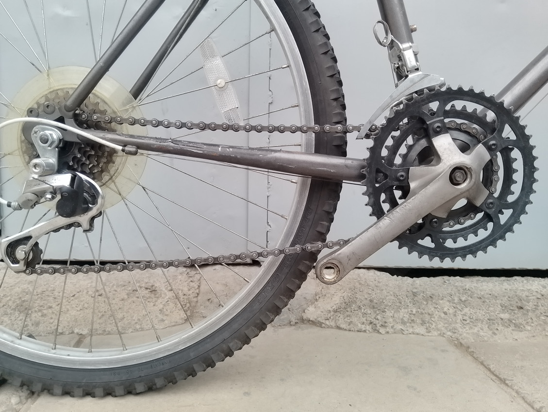 High quality used mountain bike. Wheel size 26. Frame material steel with steel fork. Top tube 22', seat tube height 19'. Gear system 3x6 with thumb shift. Cog type freewheel. Other features: all wheels have quick release.