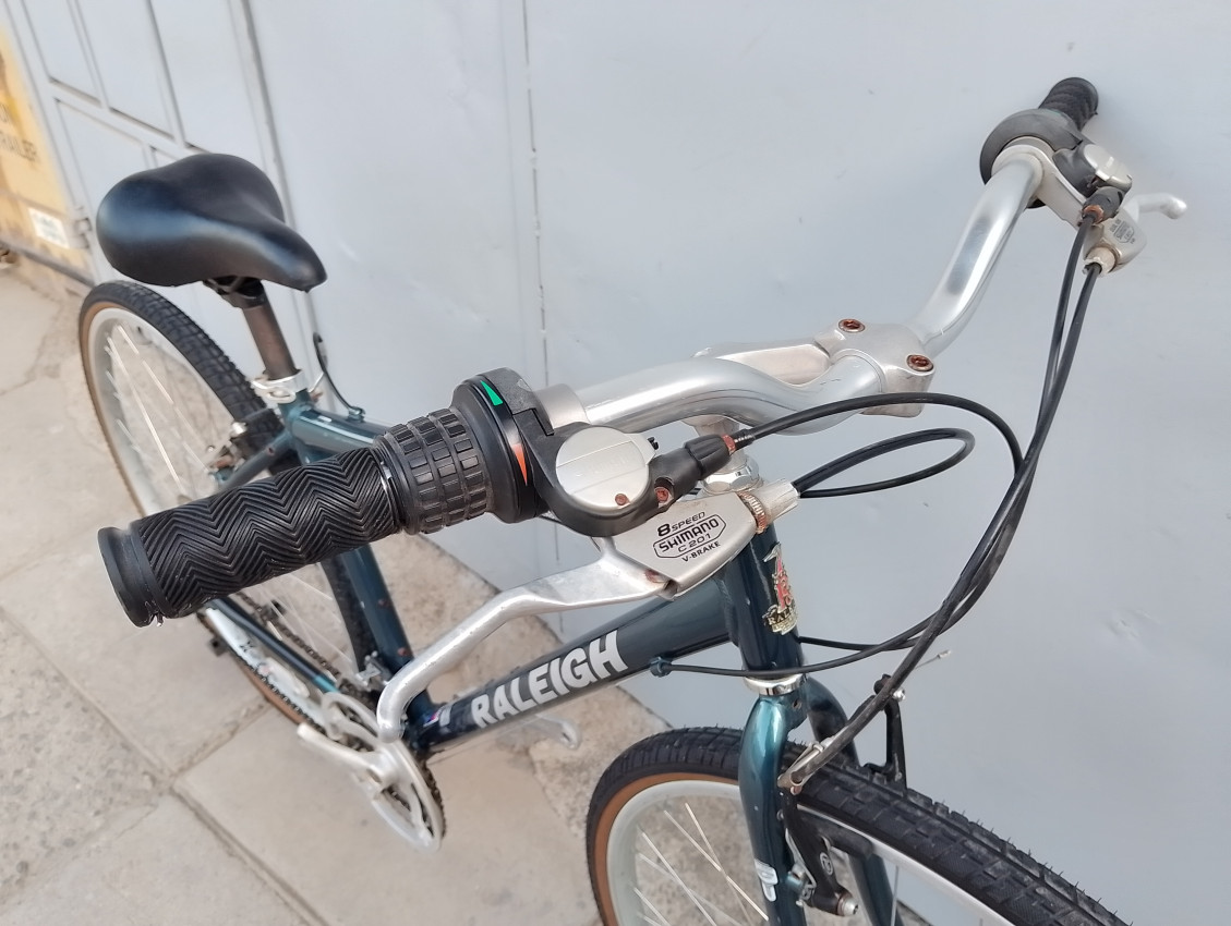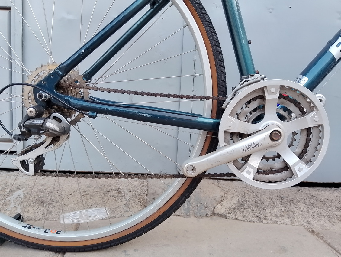High quality used hybrid bike. Wheel size 700c. Frame material Aluminium with steel fork. Top tube 21.5', seat tube height 17.5'. Gear system 3x8 with grip shift . Cog type cassette. Other features: all wheels have quick release, sealed BB.