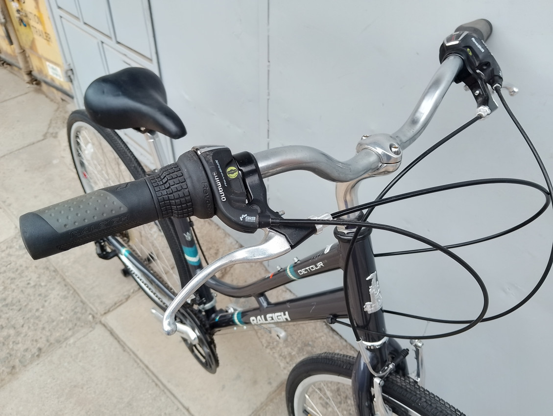 High quality used hybrid bike. Wheel size 700c. Frame material Aluminium with steel fork. Top tube 21', seat tube height 17.5'. Gear system 3x7 with shimano grip shifts. Cog type freewheel. Other features: sealed BB all wheels have quick release.