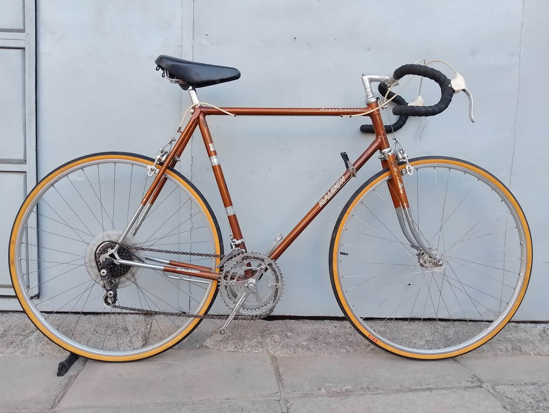 A High quality used vintage race bike. Wheel size 27 1 1/4. Frame material steel. Top tube 58cm, seat tube height 54.5cm. Gear system 2×5 with thumb shifts. Cog type freewheel. Other features: Both wheels have quick release. Front and rear aluminium rims
