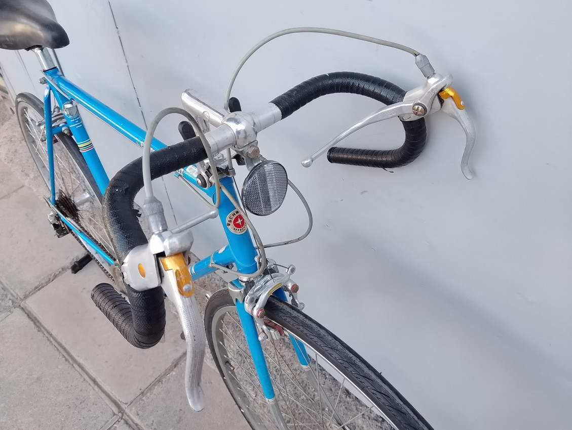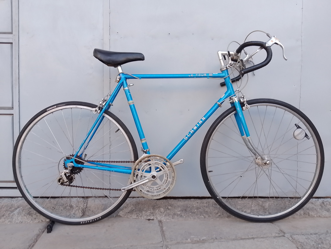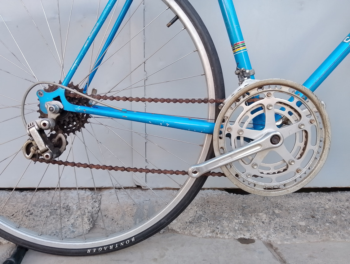 A High quality used vintage race bike. Wheel size 27 1 1/4. Frame material steel. Top tube 59cm, seat tube height 57cm. Gear system 2×5 with thumb shifts. Cog type freewheel. Other features: Both wheel have quick release, rear aluminium rim.