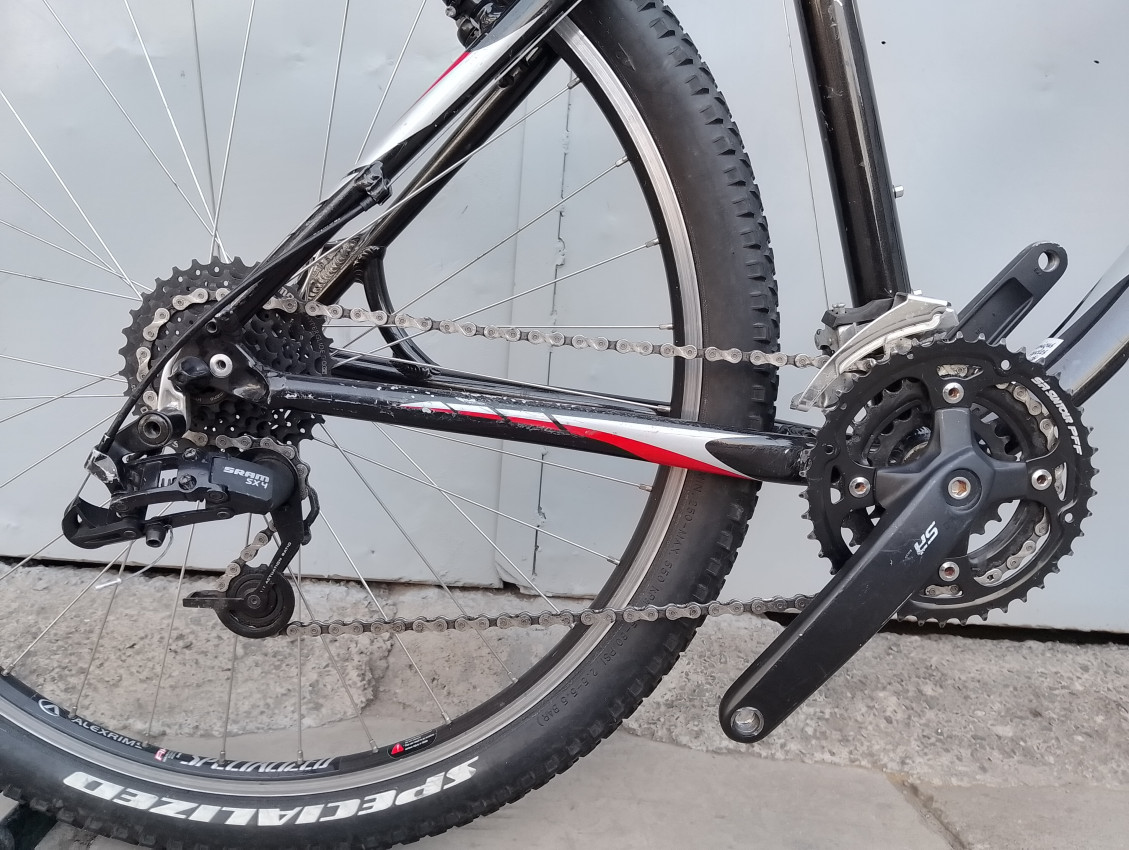 High quality used mountain bike. Wheel size 26. Frame material Aluminium with aluminium front suspension fork. Top tube 23', seat tube height 19'. Gear system 3x8 with Sram trigger shifters. Cog type cassette. Other features: Hollow tech 1 BB all wheels have quick release, threadless suspension fork.