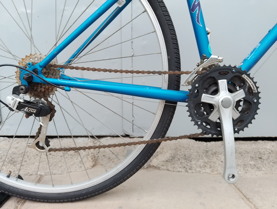High quality used hybrid bike. Wheel size 700c. Frame material steel.Top tube 20.5', seat tube height 16.5'. Gear system 3x7 with grip shifts. Cog type cassette. Other features: all wheels have quick release.