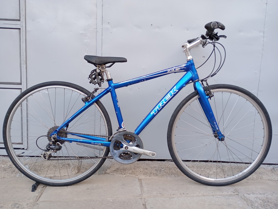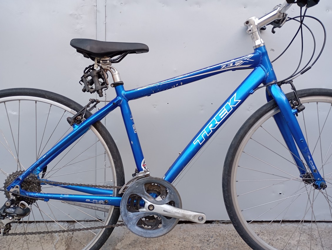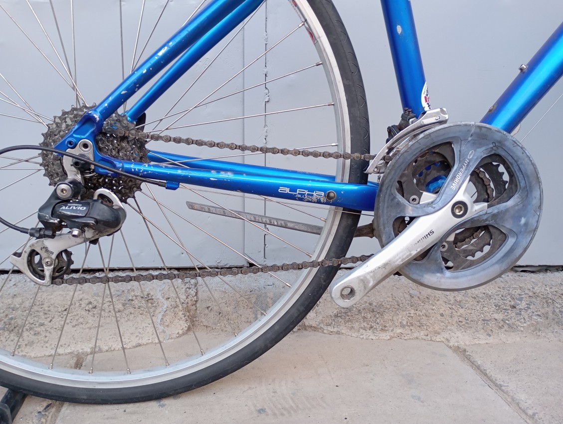 High quality used hybrid bike. Wheel size 700c. Frame material Aluminium with steel fork. Top tube 21', seat tube height 17.5 Gear system 3x8 with shimano shift brake levers. Cog type cassette. Other features: sealed BB, threadless rigid steel fork, all wheels have quick release.