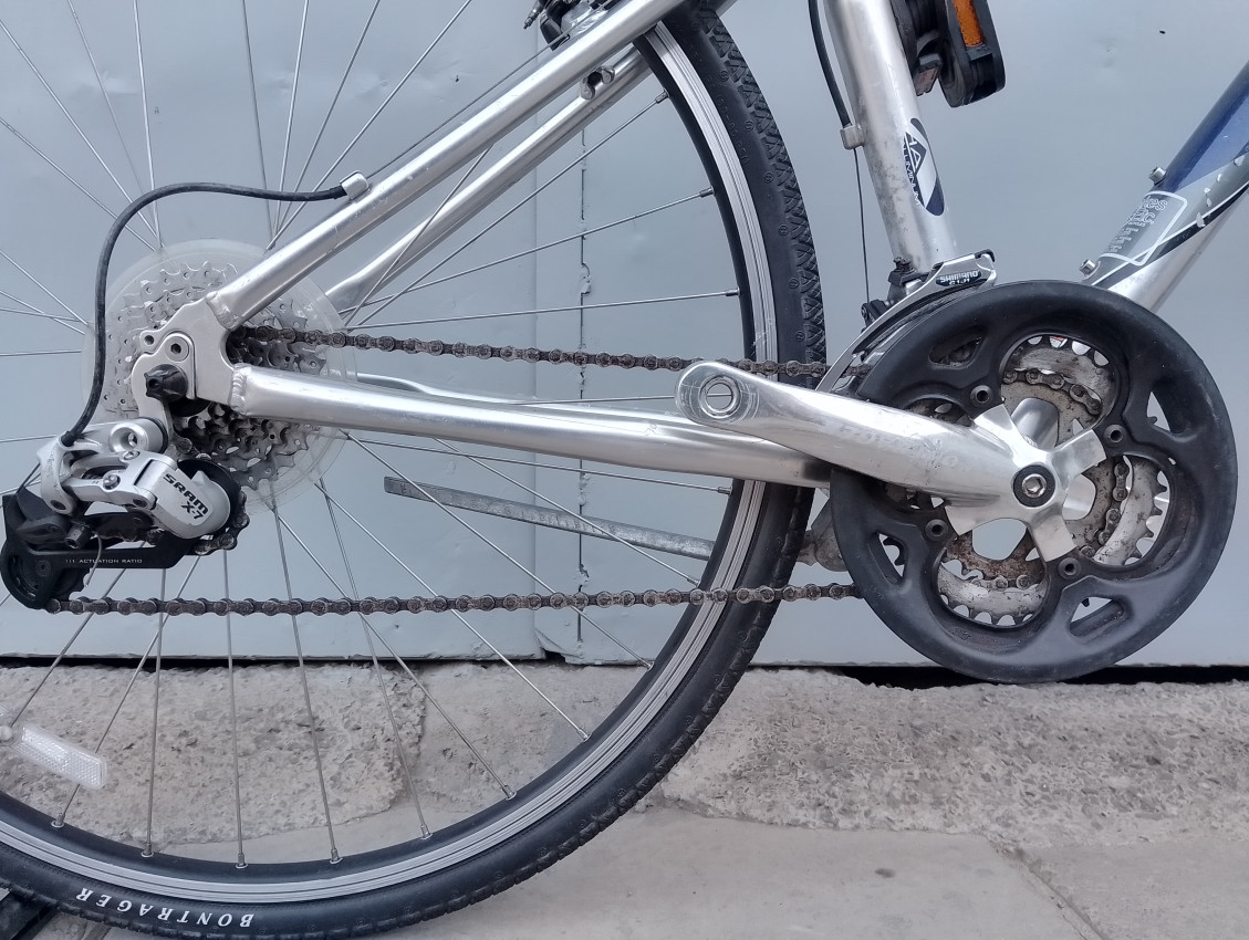 A High quality used hybrid bike. Wheel size 700c. Frame material Aluminium with alloy suspension fork. Top tube 21.5', seat tube height 20'. Gear system 3x8 with grip shifts. Cog type cassette. Other features: threaded suspension fork, all wheels have quick release. Sealed BB