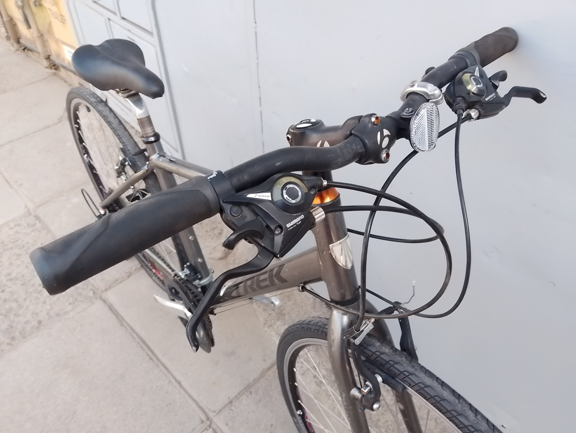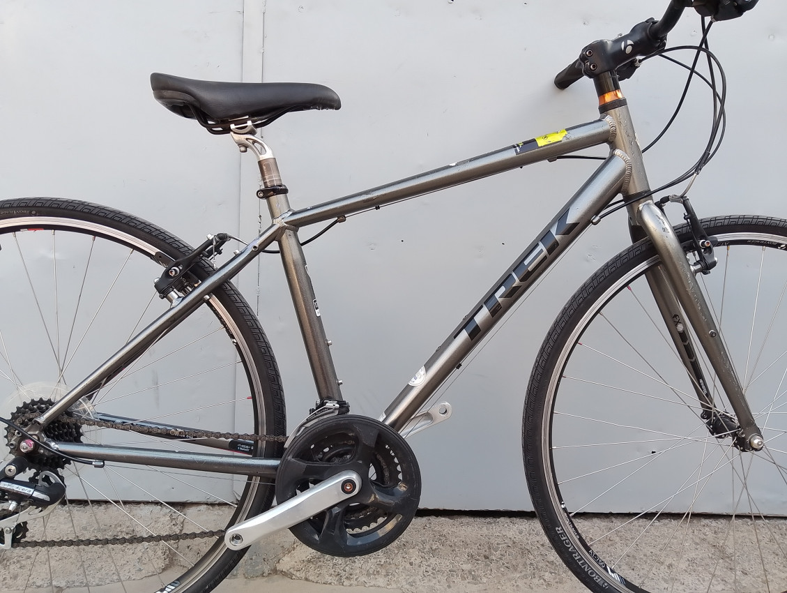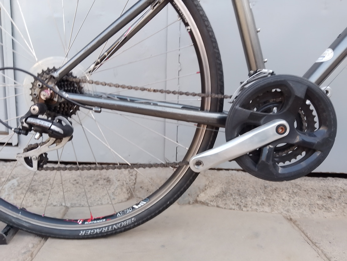 High quality used hybrid bike. Wheel size 700c. Frame material Aluminium. Top tube 21', seat tube height 17.5'. Gear system 3x7 with shimano trigger shift brake levers . Cog type freewheel.