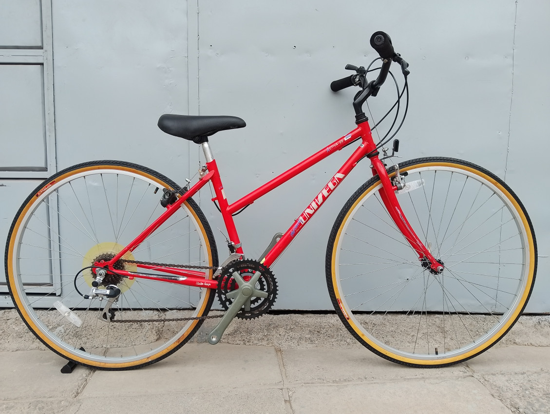 High quality used hybrid bike. Wheel size 700c. Frame material steel.Top tube 21', seat tube height 17'. Gear system 3x6 with thumb shifts. Cog type freewheel. Other features: front quick release