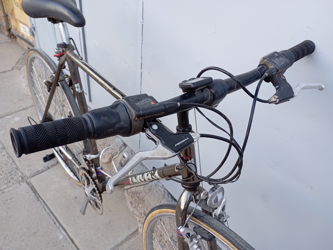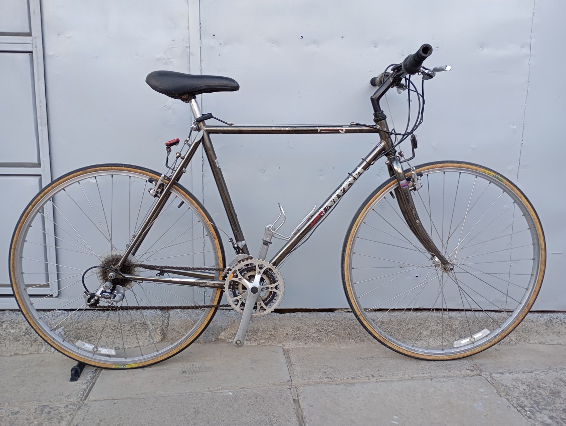 High quality used hybrid bike. Wheel size 700c. Frame material steel.Top tube 22', seat tube height 21.5'. Gear system 3x7 with grip shifts. Cog type cassette. Other features: all wheels have quick release.