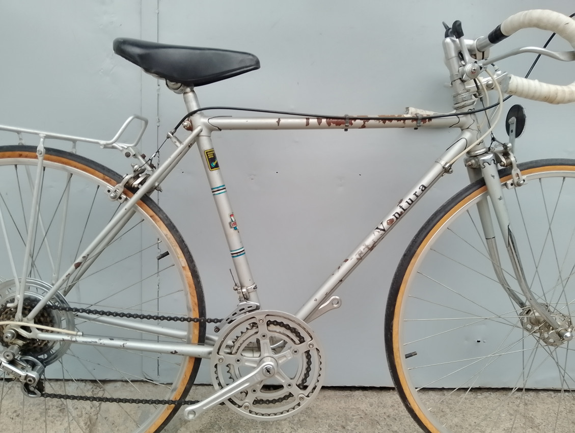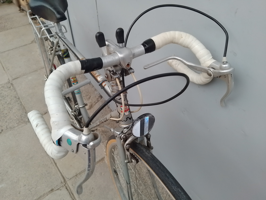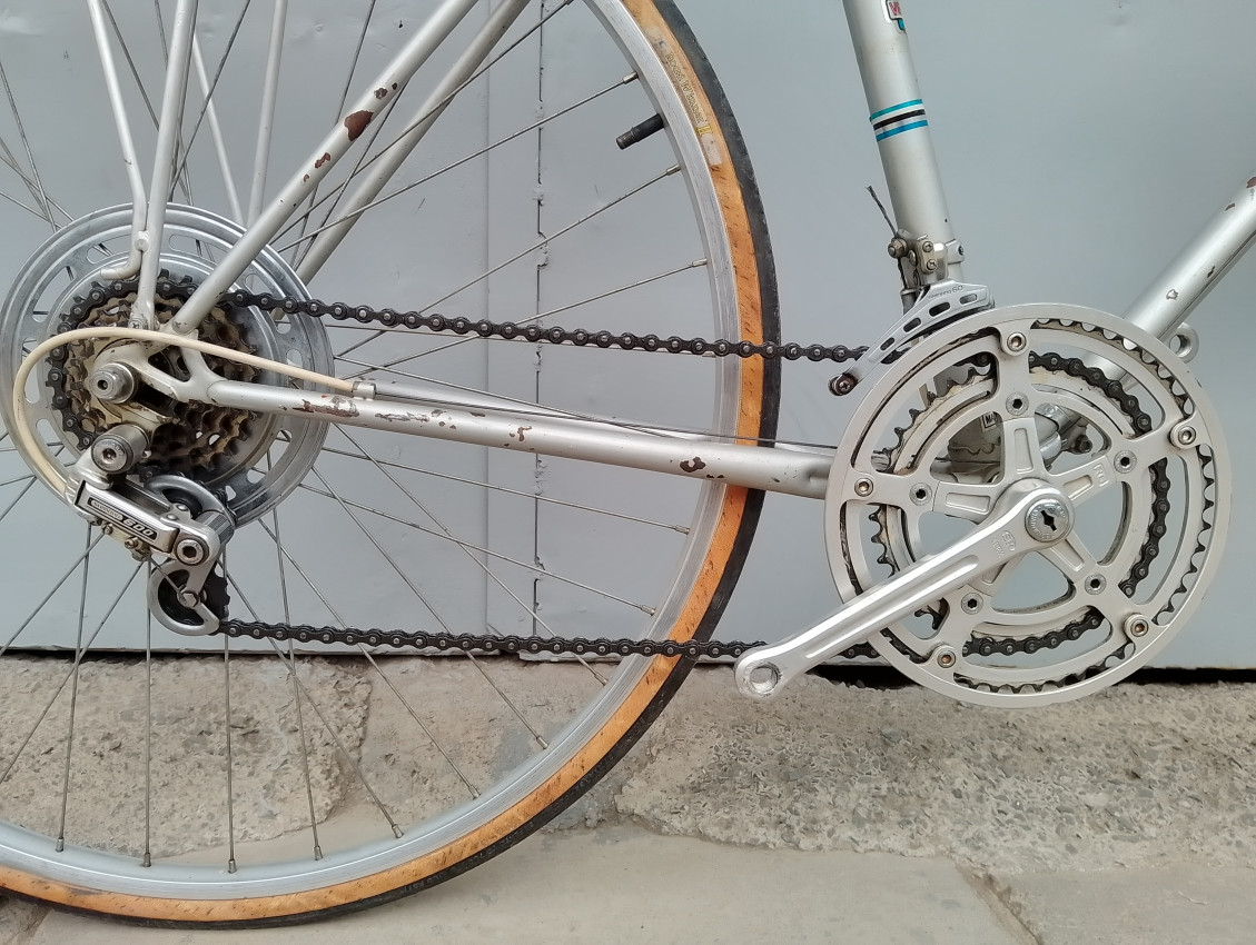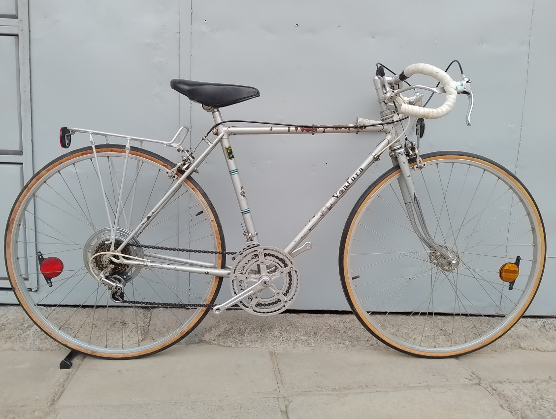 A High quality used vintage race bike. Wheel size 27 1 1/4. Frame material steel. Top tube 52.5', seat tube height 50'. Gear system 2x5 with thumb shifts. Cog type freewheel. Other features both wheels have quick release axle.