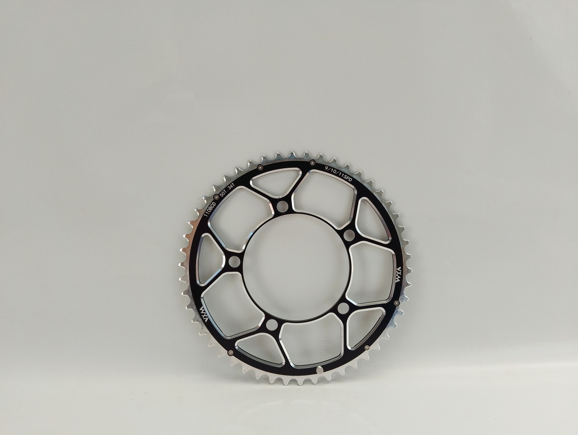 Brand new VXAA alloy chain ring, 110mm BCD 50t. Suitable for road bikes. Shimano/SRAM compatible and also compatible with 9-11 speed chains.