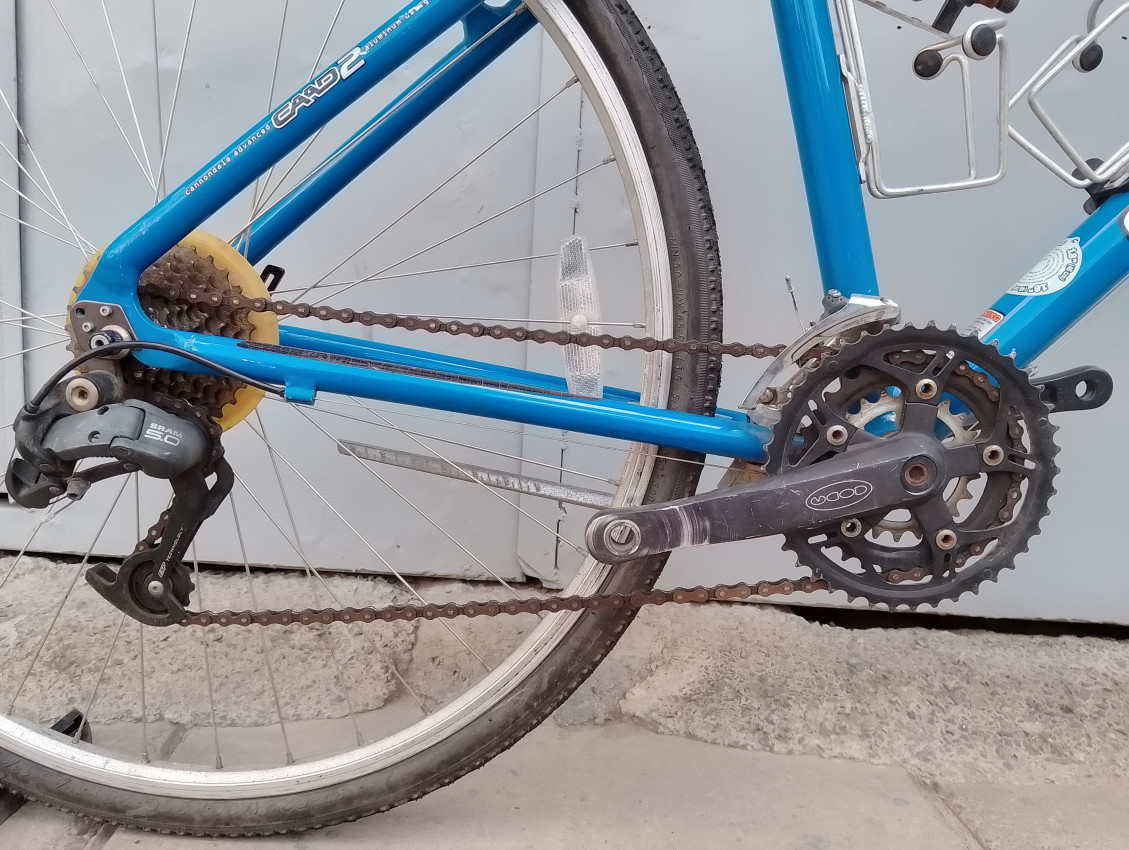 High quality used hybrid bike. Wheel size 700c. Frame material Aluminium. Top tube 22', seat tube height 18'. Gear system 3x8 with grip shifts . Cog type cassette. Other features: sealed BB all wheels have quick release.