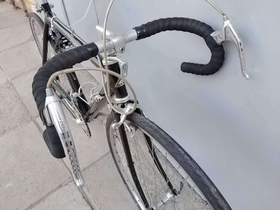 High quality used vintage race bike. Wheel size 27 1 1/4. Frame material Aluminium with steel fork.Top tube 57cm, seat tube height 56cm. Gear system 2x6 with thumb shifters. Cog type freewheel. Other features: all wheels have quick release.