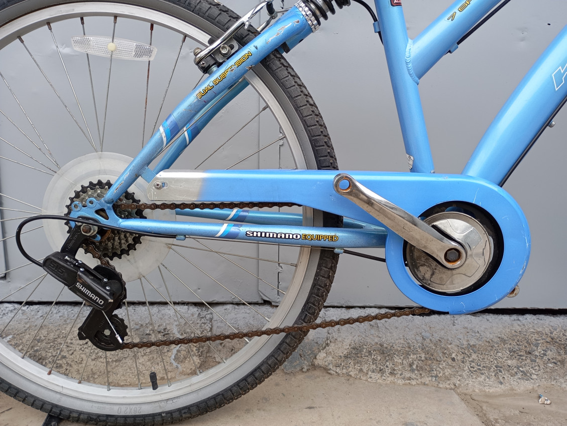 High quality used mountain bike. Wheel size 26. Frame material aluminium. Top tube 20.5', seat tube height 16' . Gear system 1x7 with grip shifters. Cog type freewheel. Other features: dual suspension