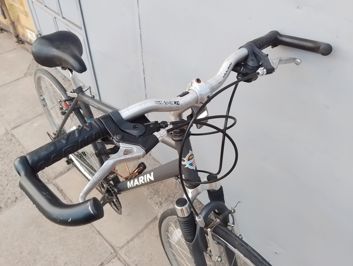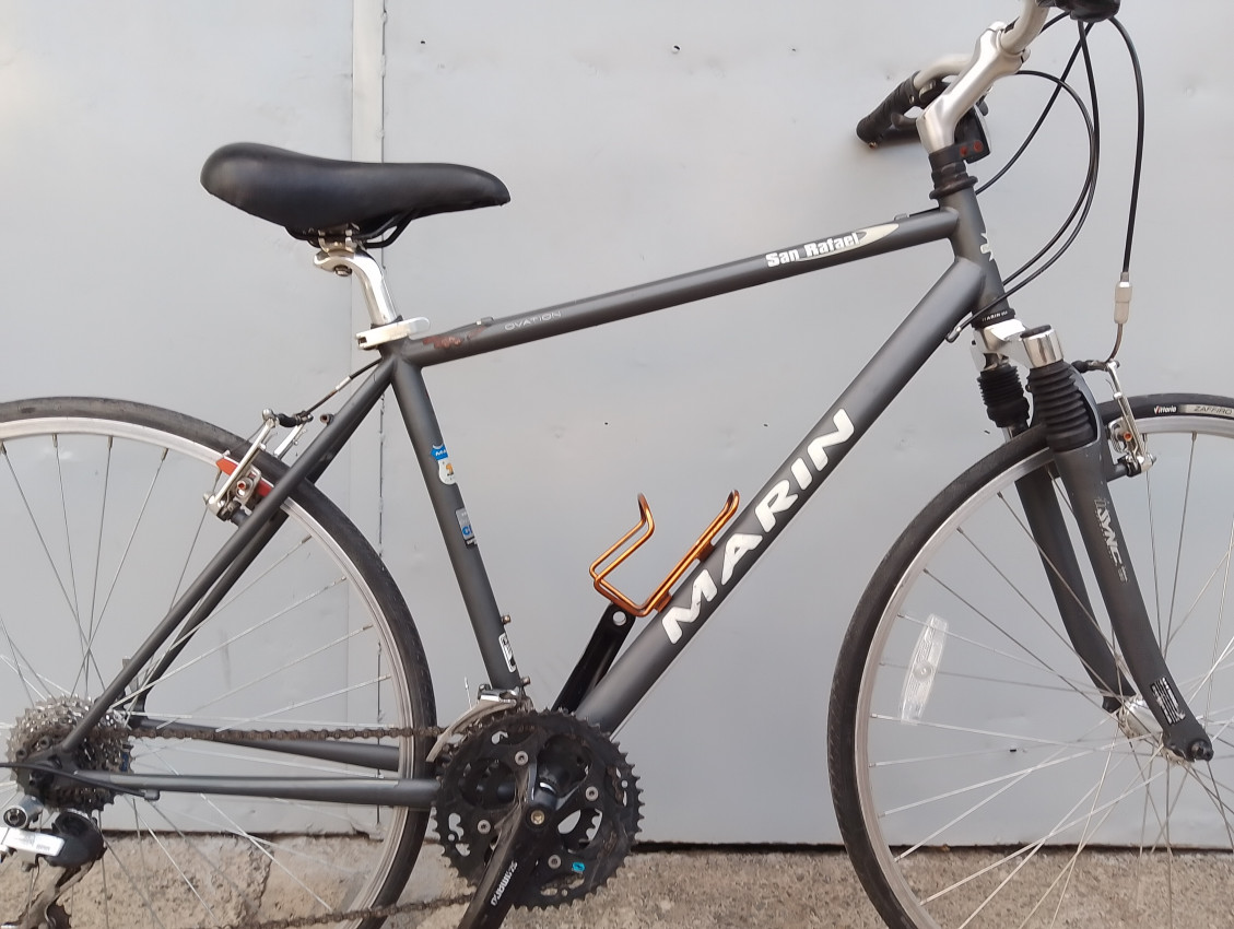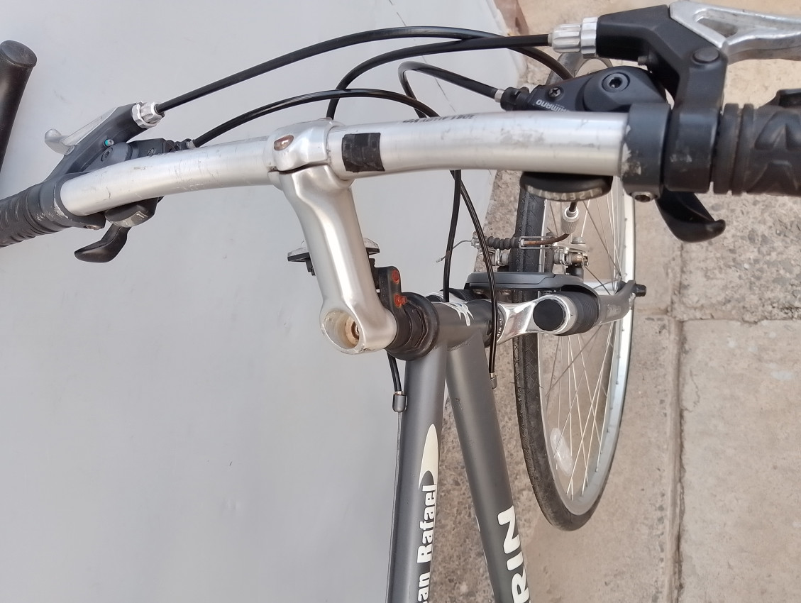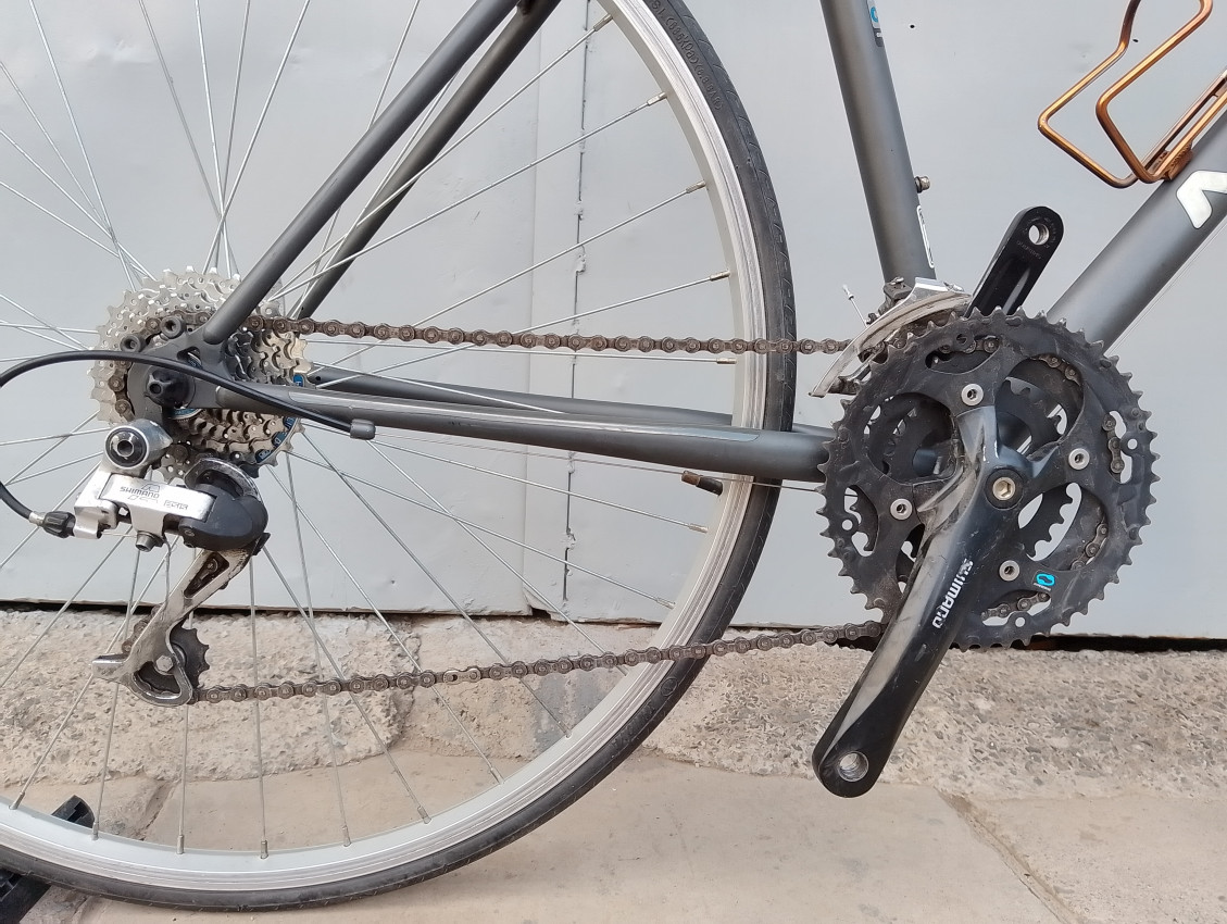 High quality used hybrid bike. Wheel size 700c. Frame material steel with front alloy suspension fork. Top tube 22', seat tube height 18.5'. Gear system 3x8 with Shimano trigger shifts. Cog type cassettee. Other features: sealed BB, all wheels have quick release, front steel/aluminium alloy suspension fork
