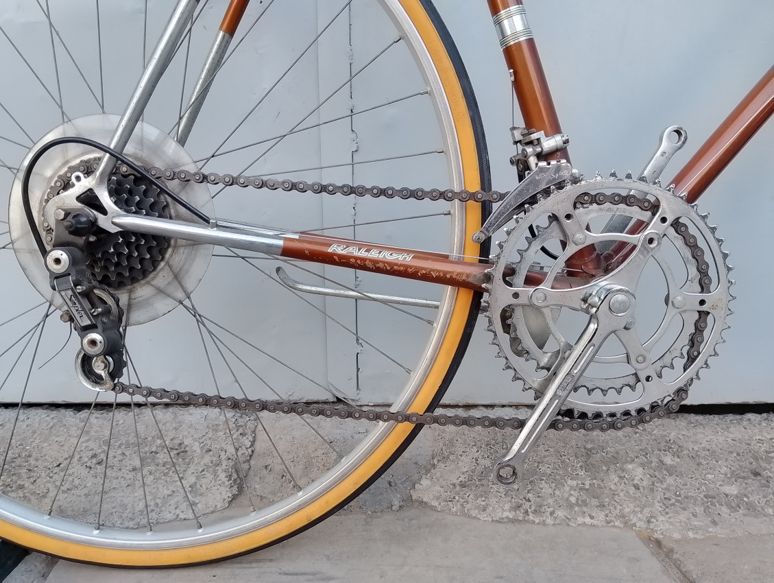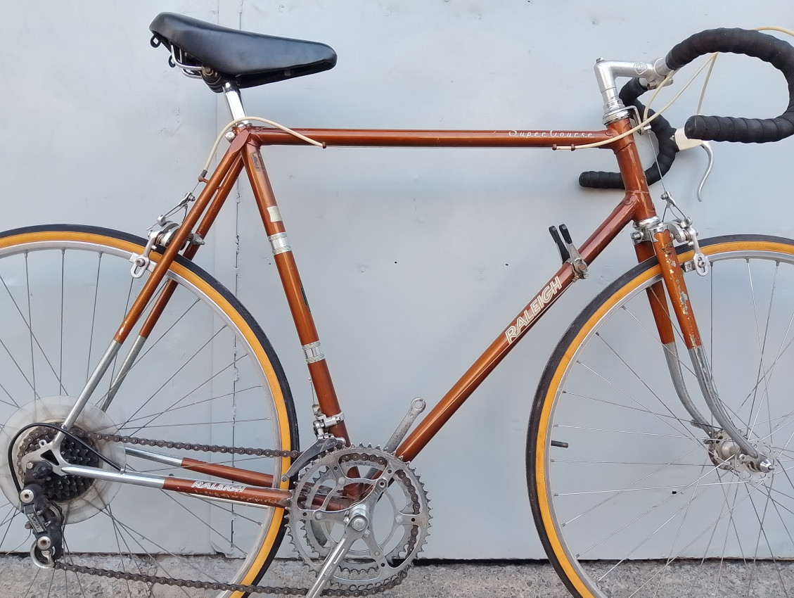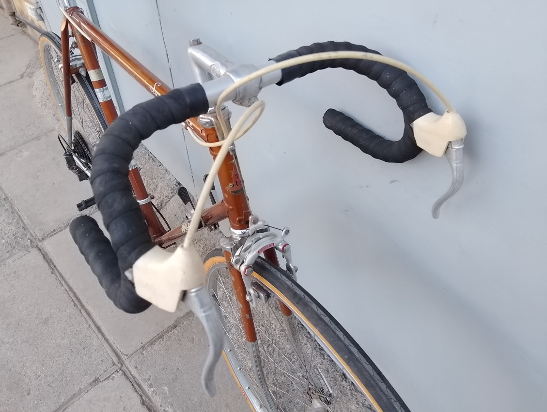A High quality used vintage race bike. Wheel size 27 1 1/4. Frame material steel. Top tube 58cm, seat tube height 54.5cm. Gear system 2×5 with thumb shifts. Cog type freewheel. Other features: Both wheels have quick release. Front and rear aluminium rims