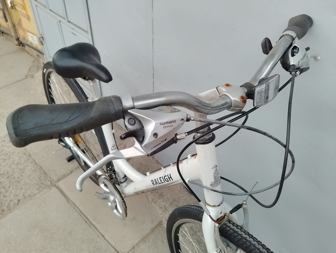 High quality used hybrid bike. Wheel size 700c. Frame material Aluminium with aluminium fork. Top tube 21', seat tube height 17.5'. Gear system 3x8 with trigger shift brake levers . Cog type cassette. Other features: sealed BB all wheels have quick release.