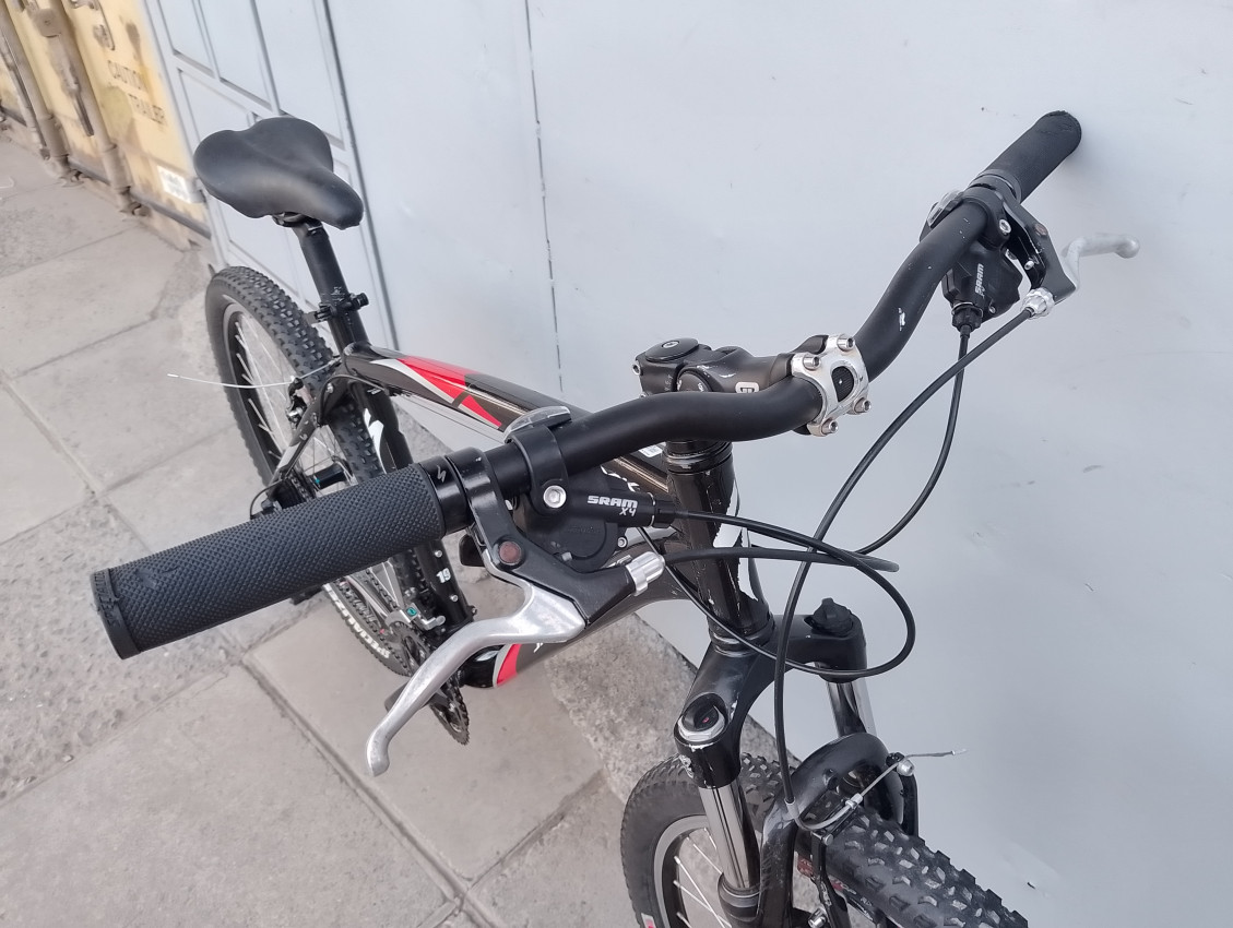 High quality used mountain bike. Wheel size 26. Frame material Aluminium with aluminium front suspension fork. Top tube 23', seat tube height 19'. Gear system 3x8 with Sram trigger shifters. Cog type cassette. Other features: Hollow tech 1 BB all wheels have quick release, threadless suspension fork.