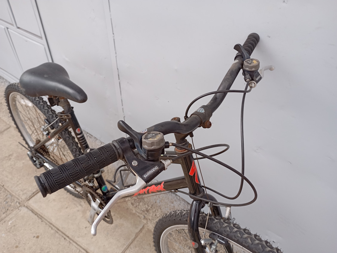 High quality used mountain bike. Wheel size 26. Frame material steel with steel fork. Top tube 20.5', seat tube height 16.5'. Gear system 3x7 with thumb shift. Cog type freewheel. Quick release on front wheel.