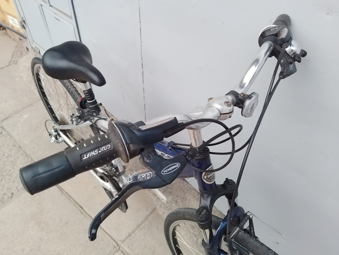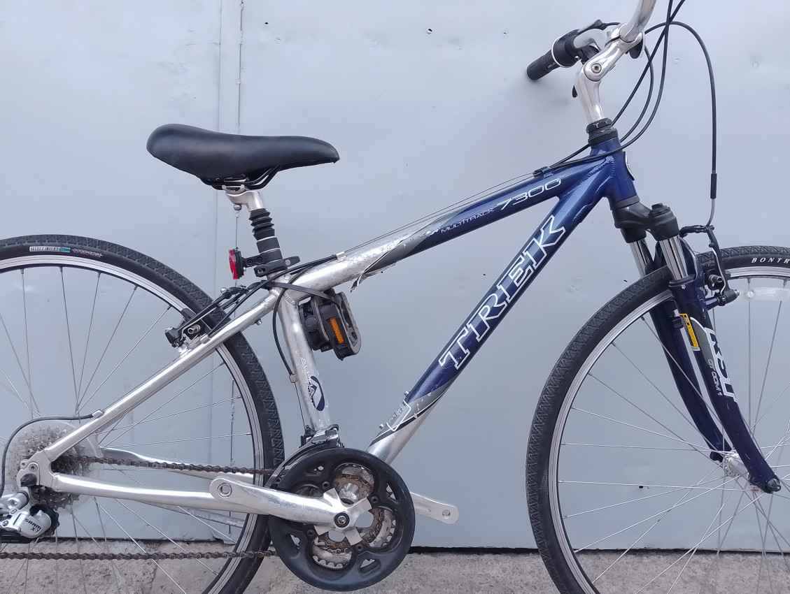 A High quality used hybrid bike. Wheel size 700c. Frame material Aluminium with alloy suspension fork. Top tube 21.5', seat tube height 20'. Gear system 3x8 with grip shifts. Cog type cassette. Other features: threaded suspension fork, all wheels have quick release. Sealed BB