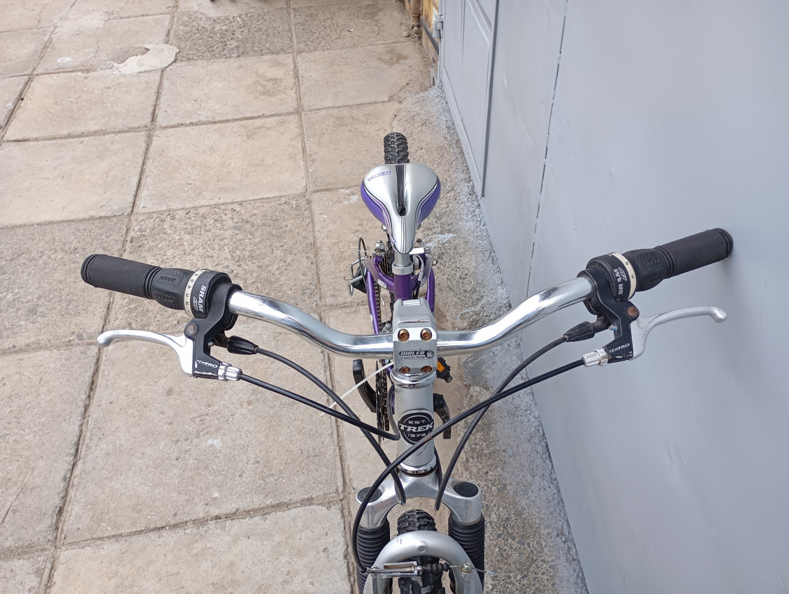 High quality used mountain bike. Wheel size 24 Frame material aluminium. Gear system 3x7 speed with grip shifters. Cog type freewheel. Other features: front suspension fork, sealed BB.